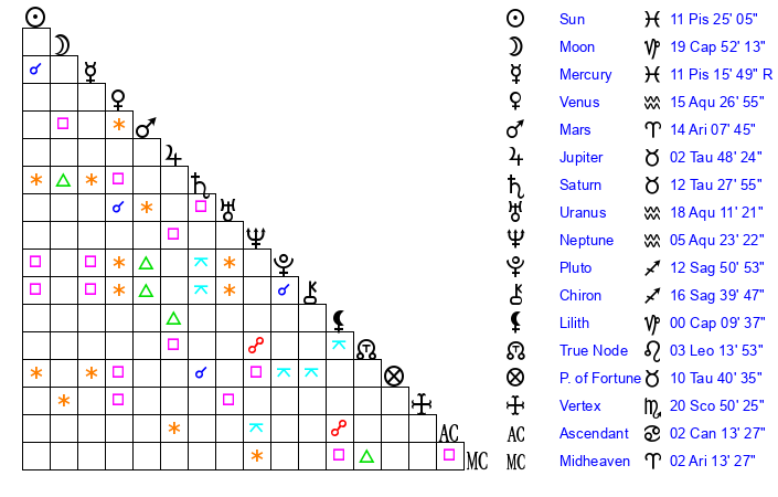 | Moon | 19 Capricorn 47 | 4 Aries 18 | 22 Sagittarius 6 |