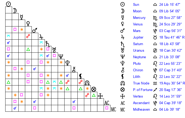 | Saturn | 19 Libra 12 | 26 Pisces 28 | 26 Libra 35 |