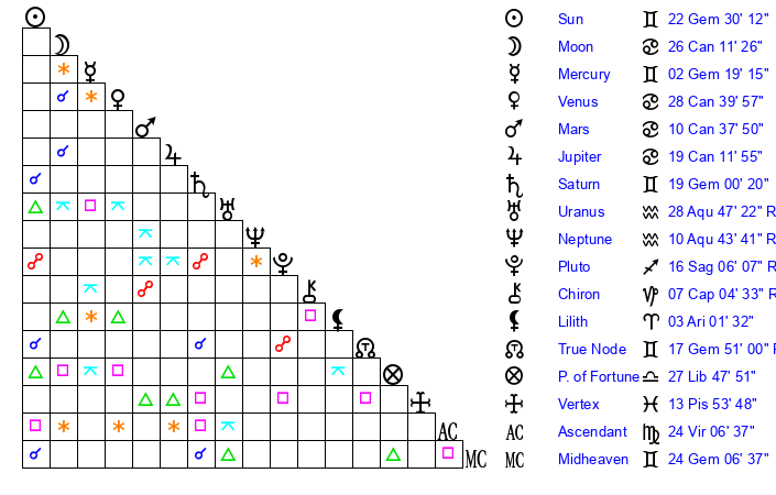 Sun | 22 Gemini 30 | 22 Gemini 56 | 14 Cancer 27 |