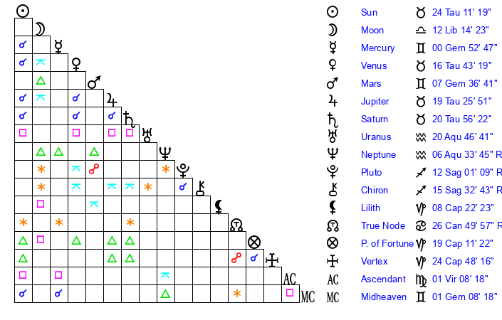 Sun | 24 Taurus 11 | 24 Taurus 9 | 18 Gemini 11 |