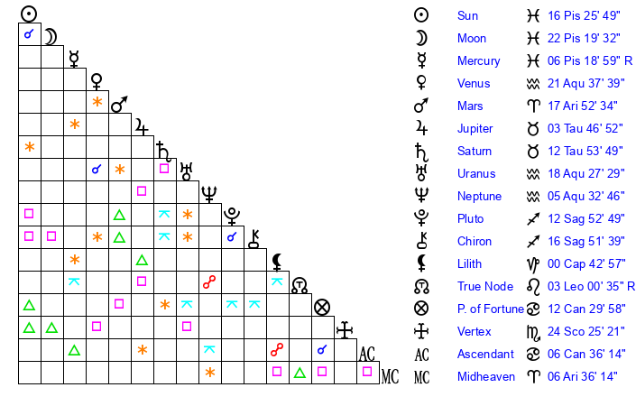 | Moon | 22 Pisces 23 | 16 Gemini 40 | 21 Aquarius 55 |