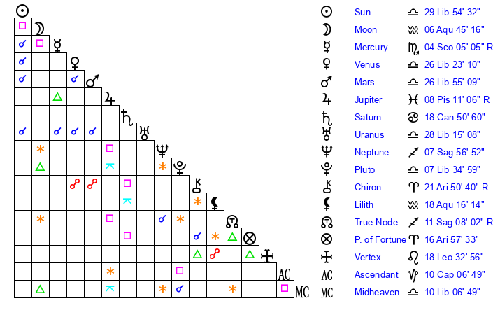 | Moon | 6 Aquarius 50 | 24 Scorpio 27 | 21 Sagittarius 29 |