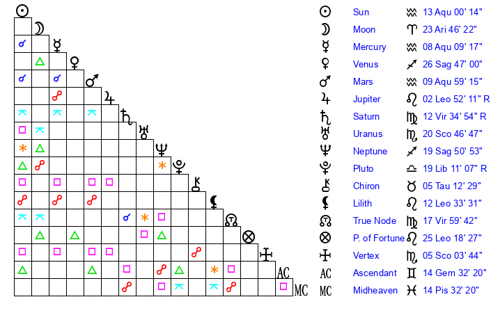 | Moon | 23 Aries 43 | 5 Aries 46 | 16 Sagittarius 19 |