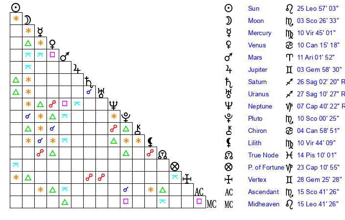 | Moon | 3 Scorpio 23 | 28 Gemini 39 | 16 Pisces 25 |