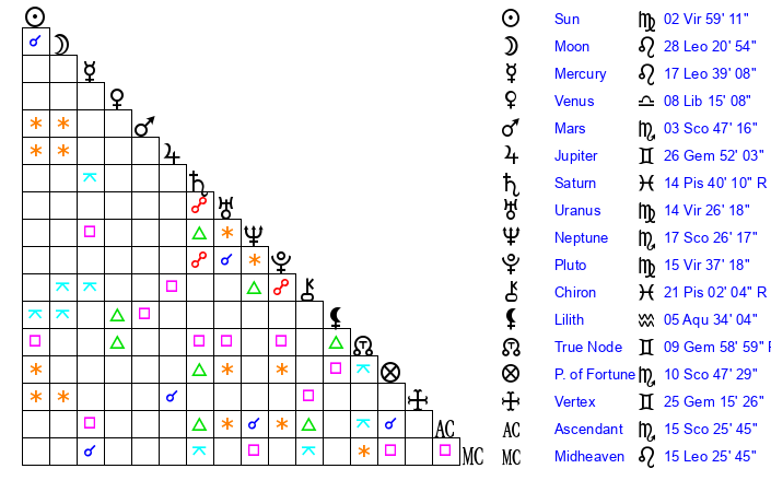 Pluto | 15 Virgo 38 | 1 Aquarius 52 | 17 Virgo 39 |