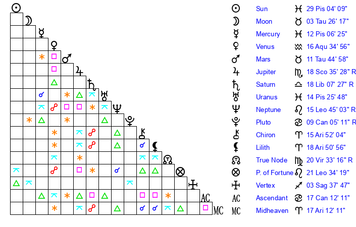 | Moon | 3 Taurus 23 | 10 Sagittarius 10 | 5 Aquarius 45 |