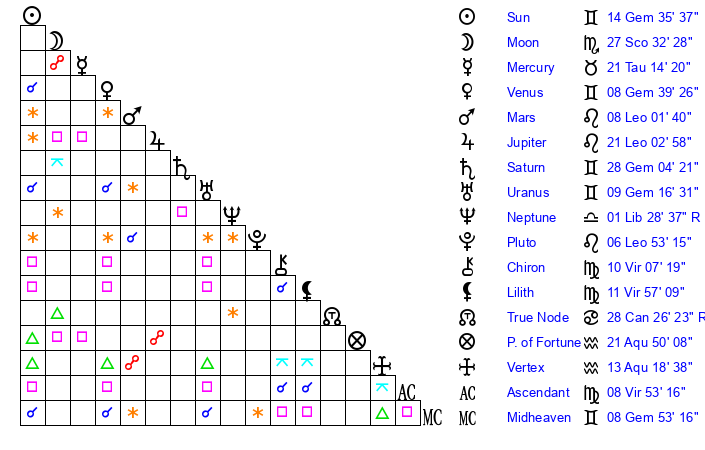 | Sun | 14 Gemini 36 | 15 Gemini 0 | 2 Virgo 4 |