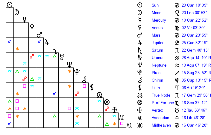 Moon | 20 Leo 3 | 12 Aquarius 59 | 19 Gemini 32 |