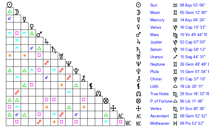 | Pluto | 15 Gemini 51 | 1 Aquarius 58 | 17 Gemini 2 |