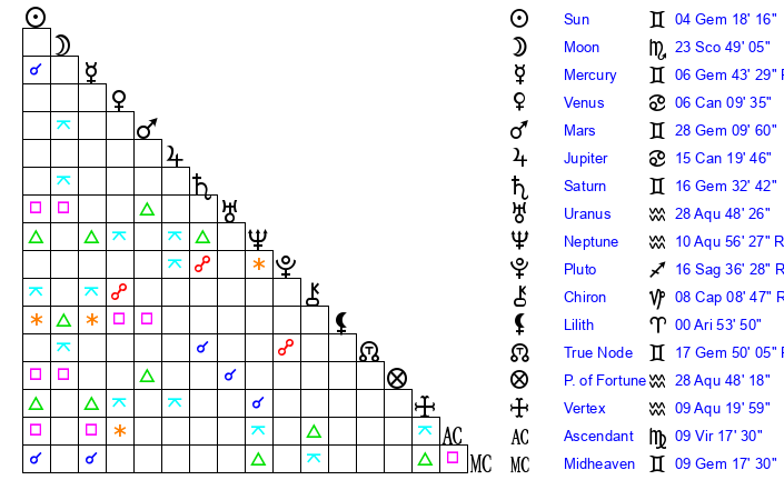 Saturn | 16 Gemini 27 | 29 Pisces 56 | 19 Gemini 26 |