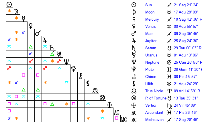 | Mercury | 25 Sagittarius 8 | 29 Sagittarius 44 | 19 Aries 37 |