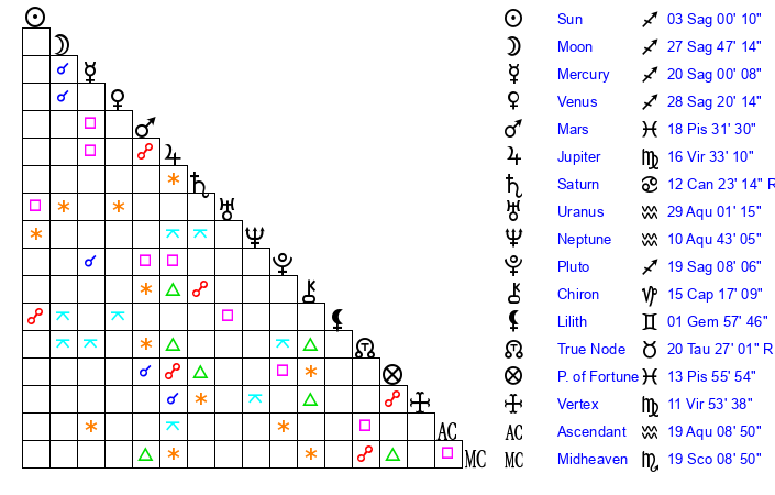 Sun | 3 Sagittarius 0 | 3 Sagittarius 55 | 24 Sagittarius 19 |