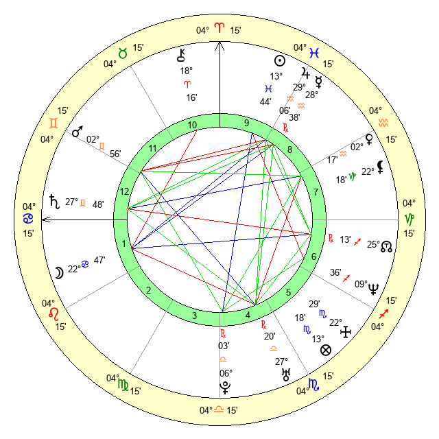 | Moon | 23 Cancer 3 | 18 Taurus 21 | 3 Gemini 26 |