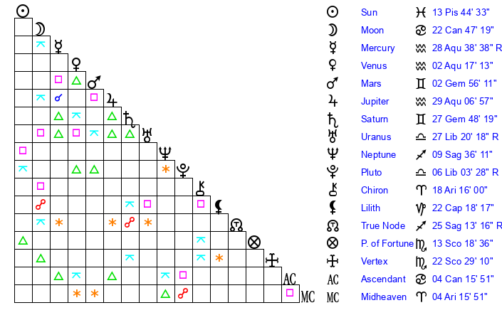 | Jupiter | 28 Aquarius 59 | 12 Gemini 35 | 10 Pisces 0 |