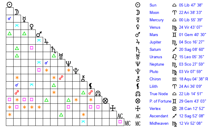 | Sun | 5 Libra 47 | 6 Libra 33 | 12 Sagittarius 48 |