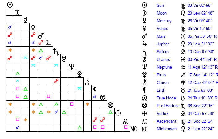 Mercury | 26 Virgo 10 | 17 Leo 42 | 12 Virgo 46 |