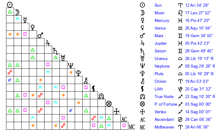 | Moon | 17 Leo 38 | 12 Gemini 27 | 27 Gemini 8 |