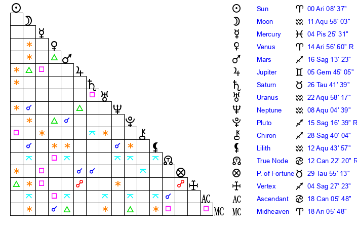 Venus | 14 Aries 58 | 4 Aries 8 | 2 Aries 20 |