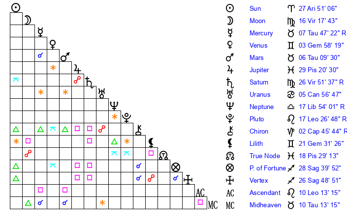 | Neptune | 17 Libra 53 | 0 Aries 41 | 16 Libra 45 |