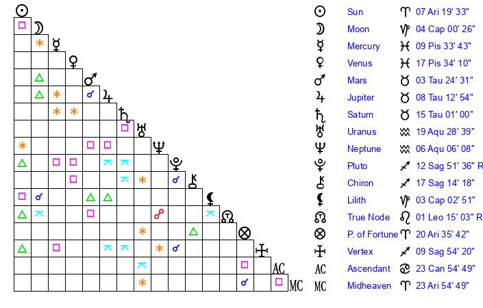 | Sun | 7 Aries 20 | 7 Aries 16 | 1 Taurus 53 |
