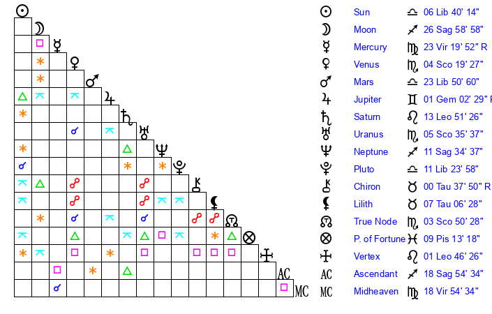 Sun | 6 Libra 40 | 6 Libra 48 | 25 Scorpio 29 |