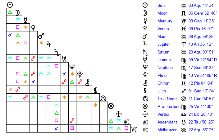 | Saturn | 23 Aquarius 14 | 16 Pisces 35 | 0 Pisces 22 |