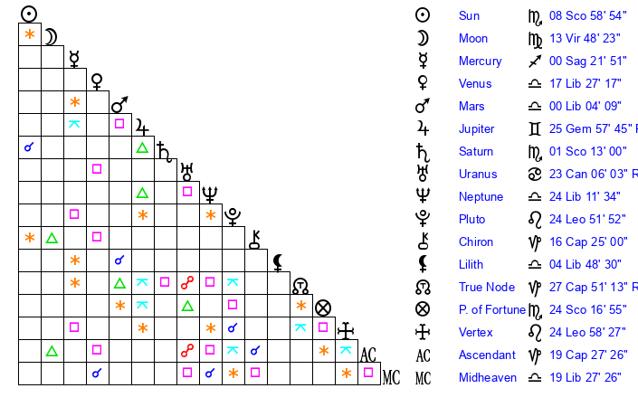 | Sun | 8 Scorpio 59 | 9 Scorpio 31 | 21 Capricorn 58 |