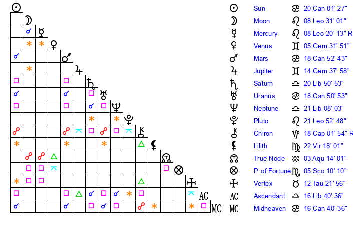 | Moon | 8 Leo 24 | 12 Aquarius 59 | 22 Pisces 37 |