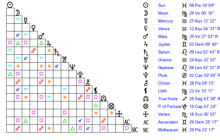 | Sun | 8 Pisces 18 | 9 Pisces 21 | 22 Gemini 48 |