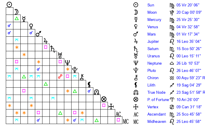 Mercury | 25 Virgo 25 | 22 Leo 23 | 28 Libra 44 |