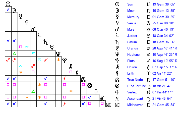 Moon | 16 Gemini 21 | 13 Sagittarius 11 | 22 Aries 18 |
