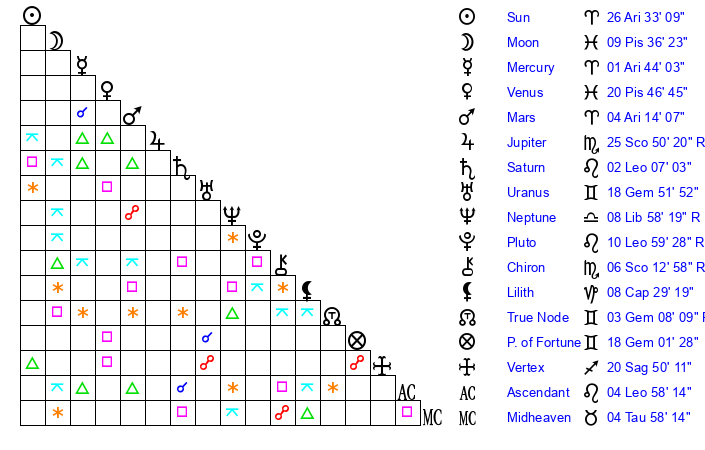 Moon | 9 Pisces 59 | 16 Sagittarius 6 | 22 Capricorn 39 |