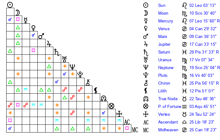 | Neptune | 19 Scorpio 25 | 2 Aries 3 | 20 Scorpio 7 |