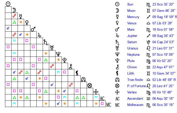 | Neptune | 7 Scorpio 18 | 29 Pisces 31 | 9 Scorpio 1 |