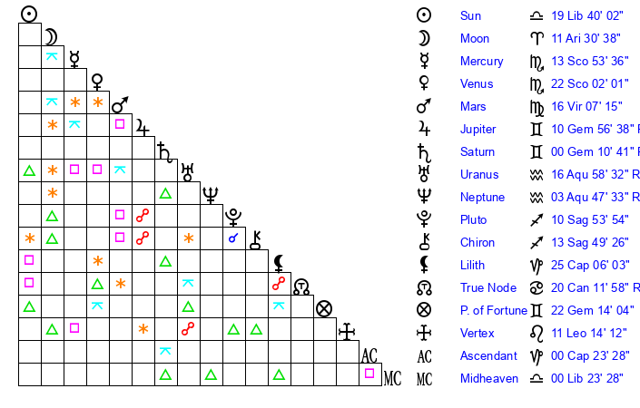 Sun | 19 Libra 40 | 19 Libra 37 | 14 Scorpio 36 |