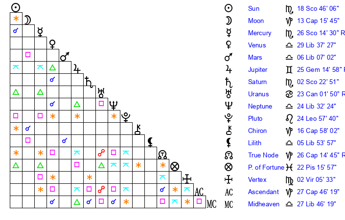 | Sun | 18 Scorpio 46 | 19 Scorpio 18 | 1 Aquarius 54 |