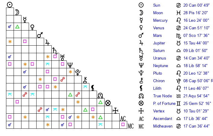| Venus | 24 Cancer 51 | 8 Gemini 41 | 24 Libra 45 |