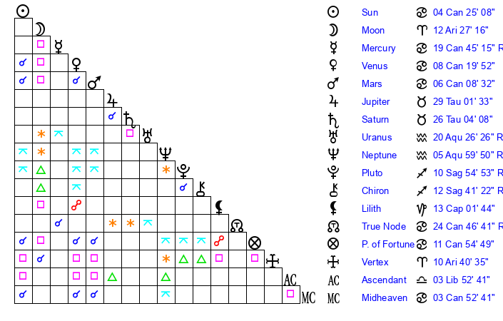 Moon | 12 Aries 14 | 8 Cancer 1 | 13 Pisces 49 |
