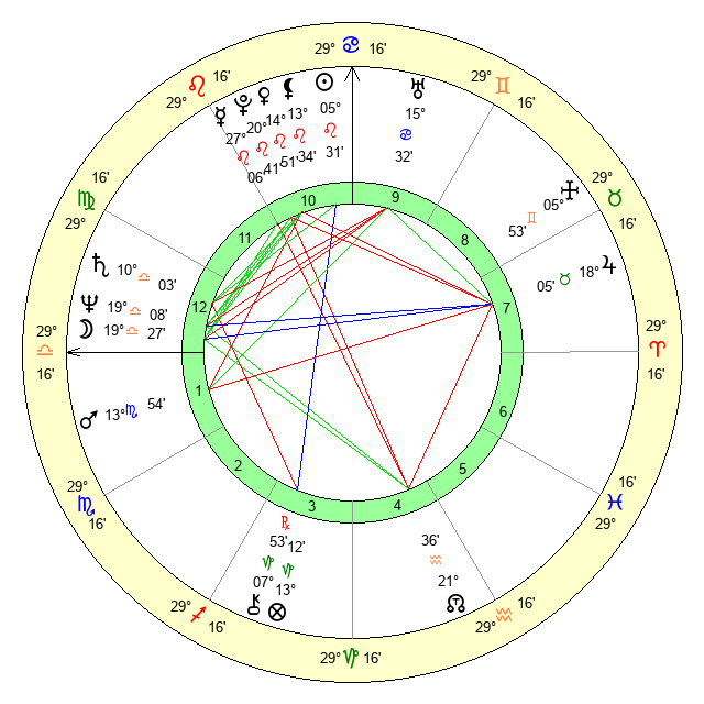 | Moon | 19 Libra 21 | 23 Virgo 28 | 4 Cancer 7 |