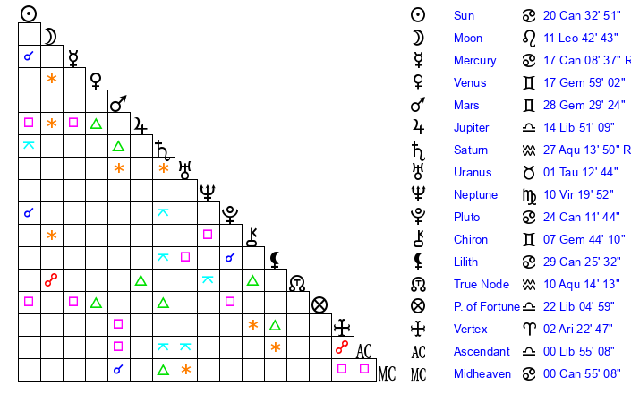 | Pluto | 24 Cancer 11 | 2 Aquarius 51 | 26 Cancer 1 |