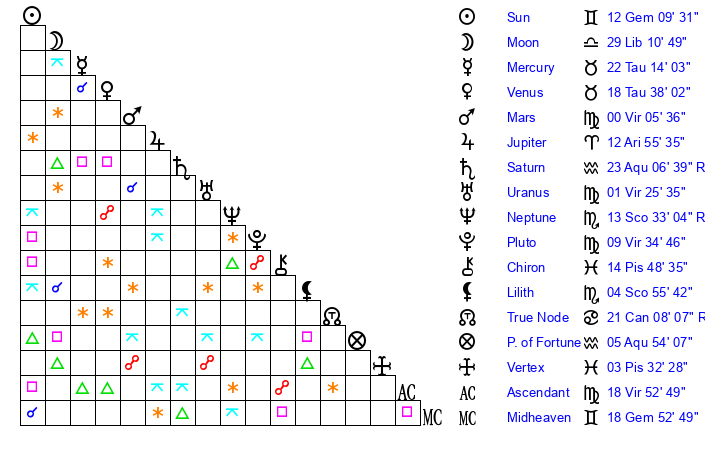| Neptune | 13 Scorpio 32 | 1 Aries 54 | 12 Scorpio 54 |