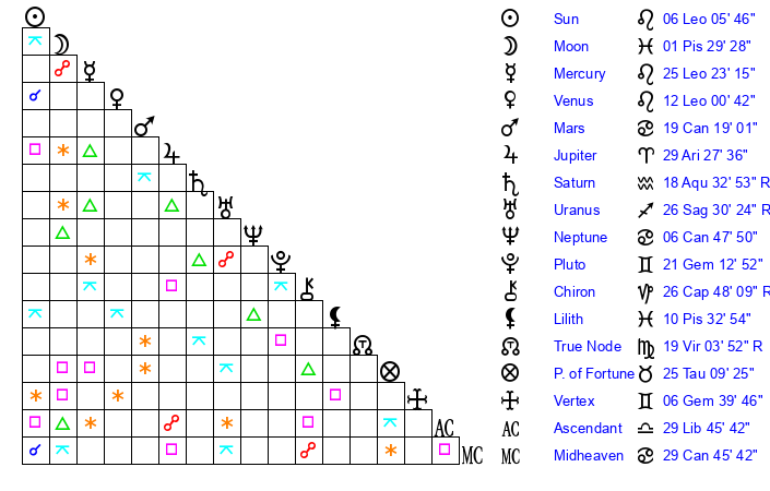 | Mercury | 25 Leo 24 | 10 Leo 41 | 19 Sagittarius 58 |