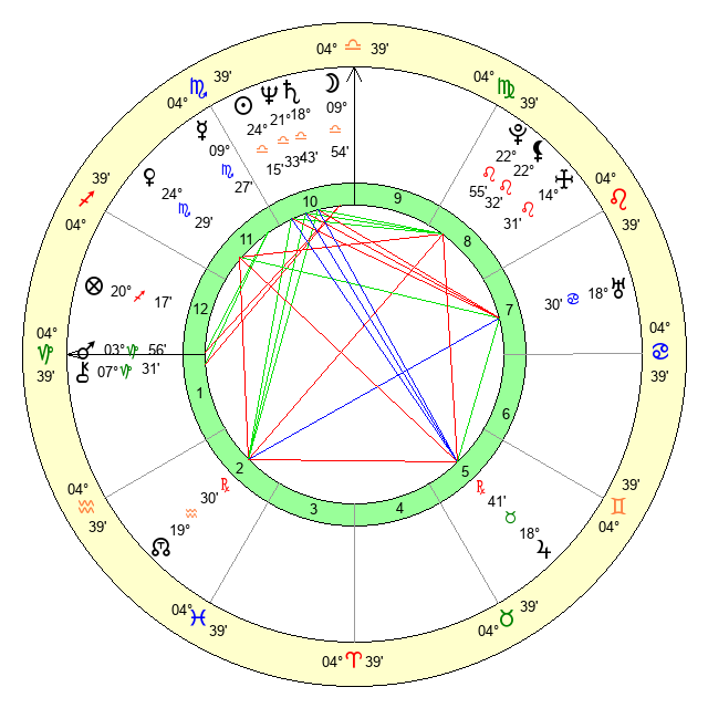 | Moon | 9 Libra 58 | 11 Virgo 53 | 20 Gemini 29 |