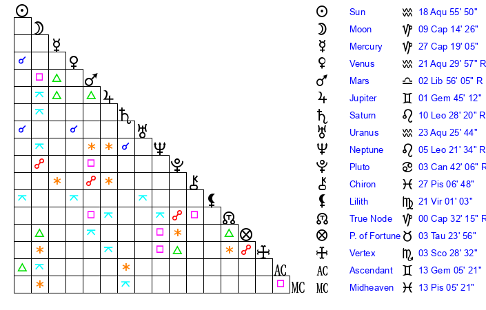 | Sun | 18 Aquarius 56 | 19 Aquarius 58 | 4 Gemini 24 |