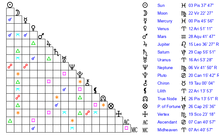 | Sun | 3 Pisces 38 | 5 Pisces 5 | 4 Gemini 57 |