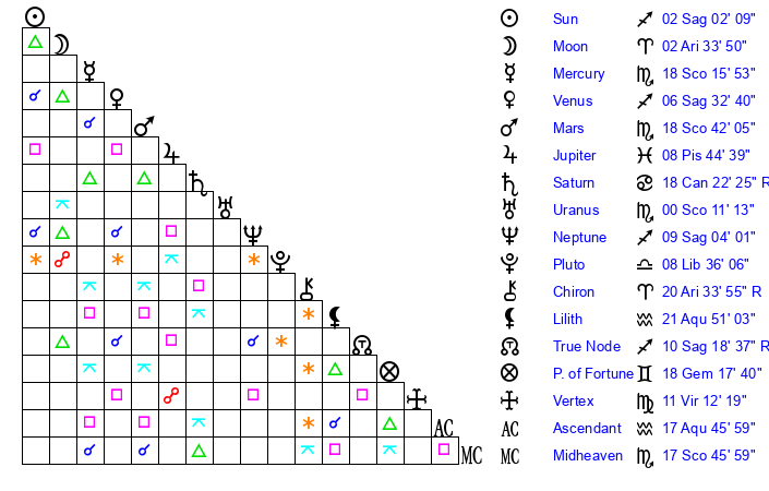 | Mercury | 18 Scorpio 16 | 22 Sagittarius 31 | 7 Aquarius 46 |