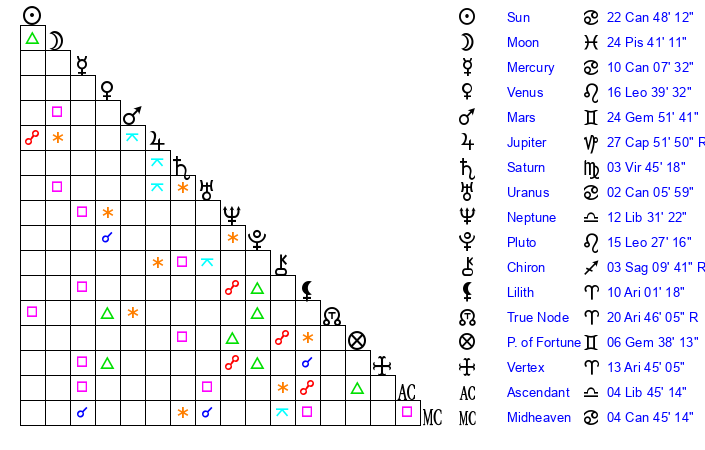 Sun | 22 Cancer 48 | 23 Cancer 25 | 6 Libra 10 |