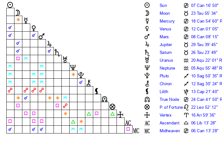 Moon | 23 Taurus 50 | 19 Leo 48 | 21 Aries 42 |