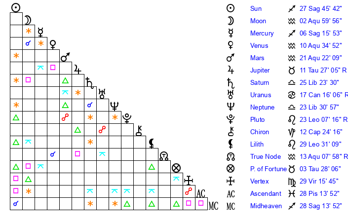 | Sun | 27 Sagittarius 45 | 28 Sagittarius 2 | 11 Pisces 49 |