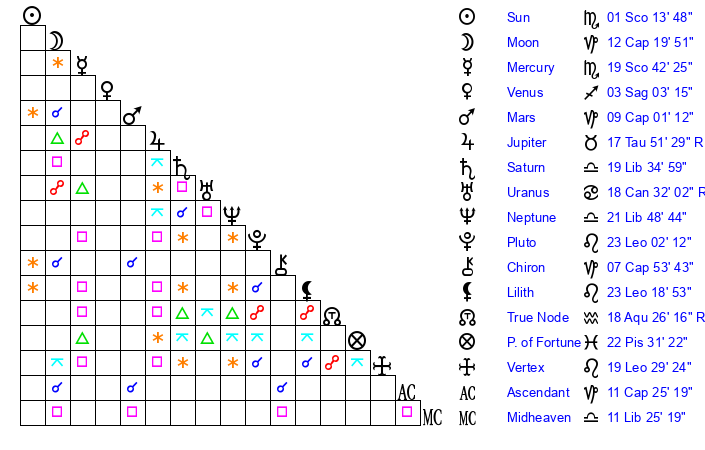 | Sun | 1 Scorpio 14 | 1 Scorpio 32 | 15 Capricorn 5 |